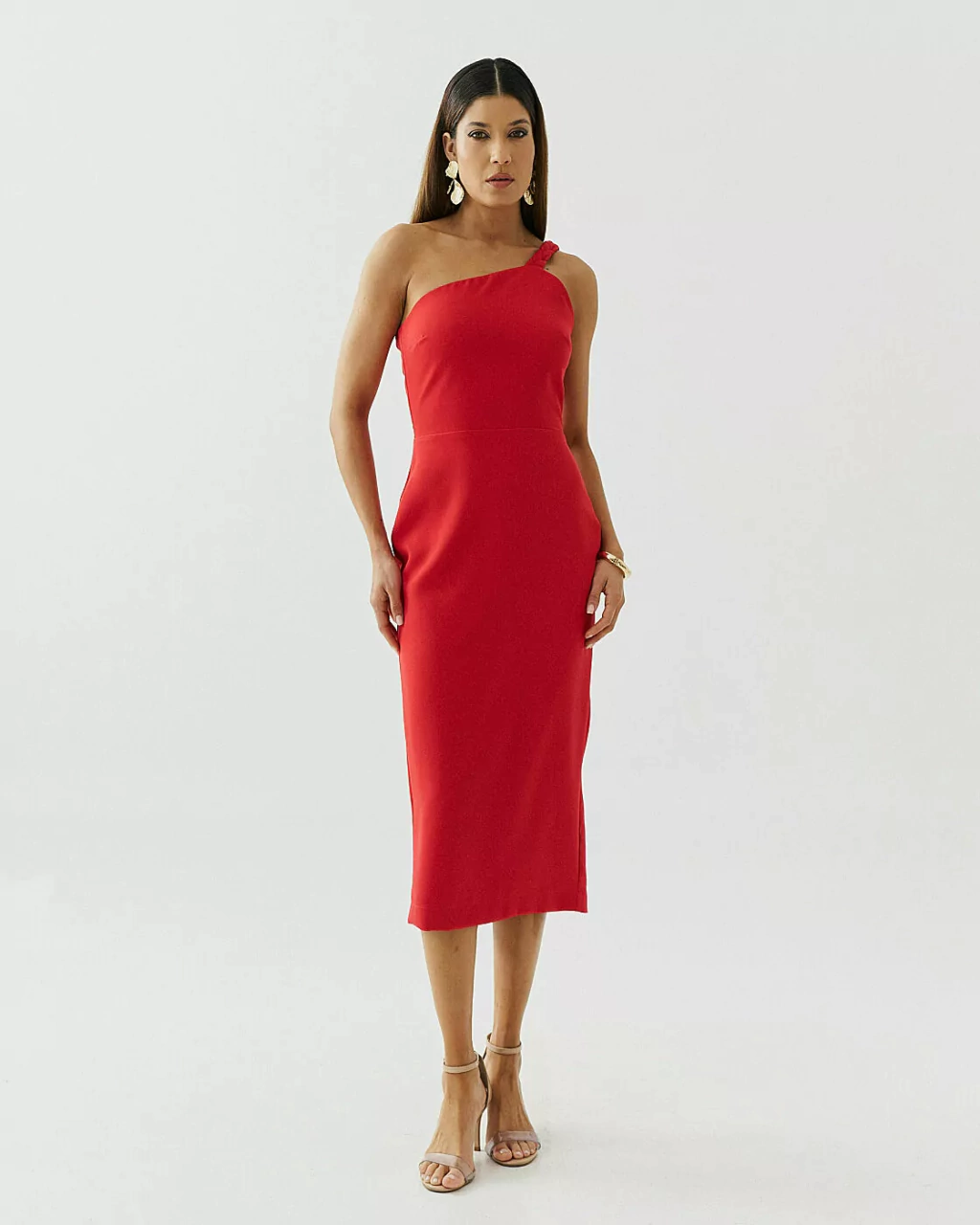 É o vestido ideal para quem deseja expressar personalidade, confiança e elegância sem esforço. O vermelho vibrante adiciona um toque de ousadia refinada, enquanto o corte assimétrico e a alça trançada garantem um visual que se destaca pela originalidade e sofisticação.
